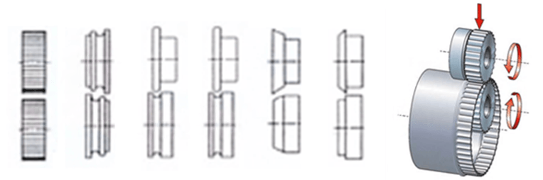 Комплект роликов для гофрирования листа. Формирует на краях труб (торцах) гофрирующий профиль. Особенность данного профиля - уменьшение диаметра или обхвата трубы для стыковки (фиксации труб друг с другом). |